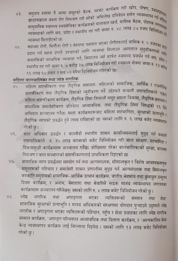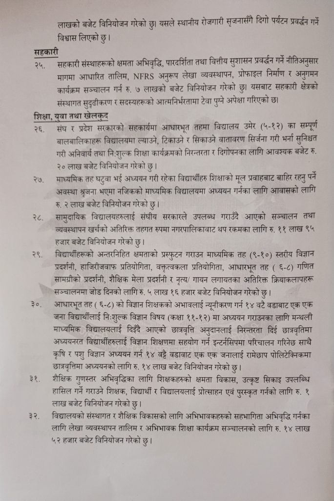 प्रस्तुत बजेटमा विषयगत तथा क्षेत्रगत रुपमा कुन क्षेत्रमा कति बजेट विनियोजन भएकाे छ । तल जस्ताकाे तस्तै राखिएकाे छ ।