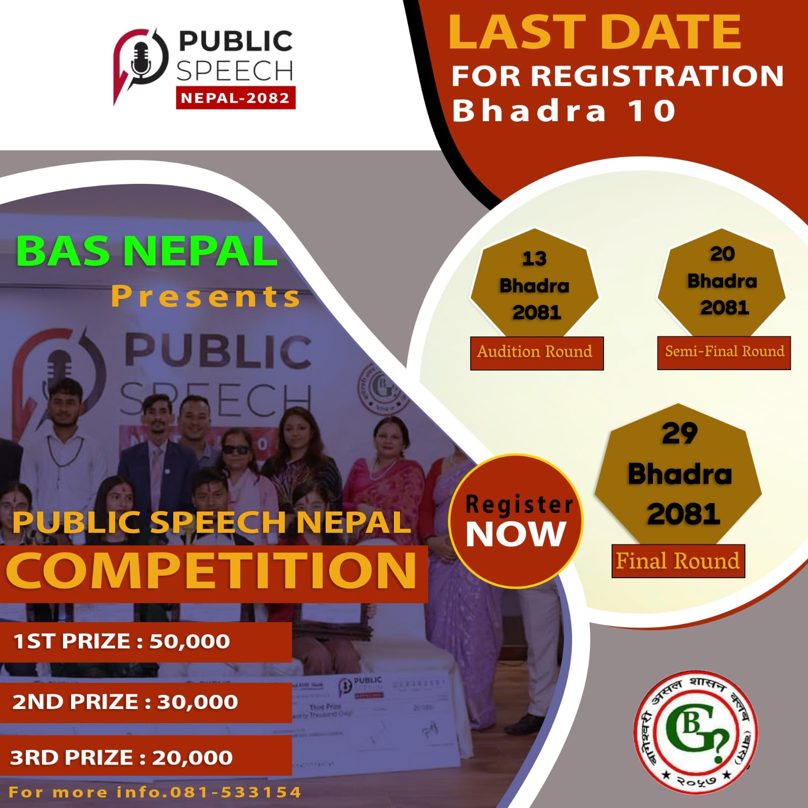 युवाहरुको बक्तृत्वकला क्षमता अभिबृद्धी गर्ने, युवाहरुको वाक क्षमता प्रष्फुटन गर्न उत्प्रेरित गर्ने, सार्वजनिक भाषणकलाका च्याम्पियनहरुलाई प्रोत्साहीत गर्ने लगायतका उद्धेश्य राख्दै बास नेपाल नामक गैर सरकारी संस्थाले राष्ट्रब्यापी रुपमा प्रतियोगिता गर्न लागेको हो ।